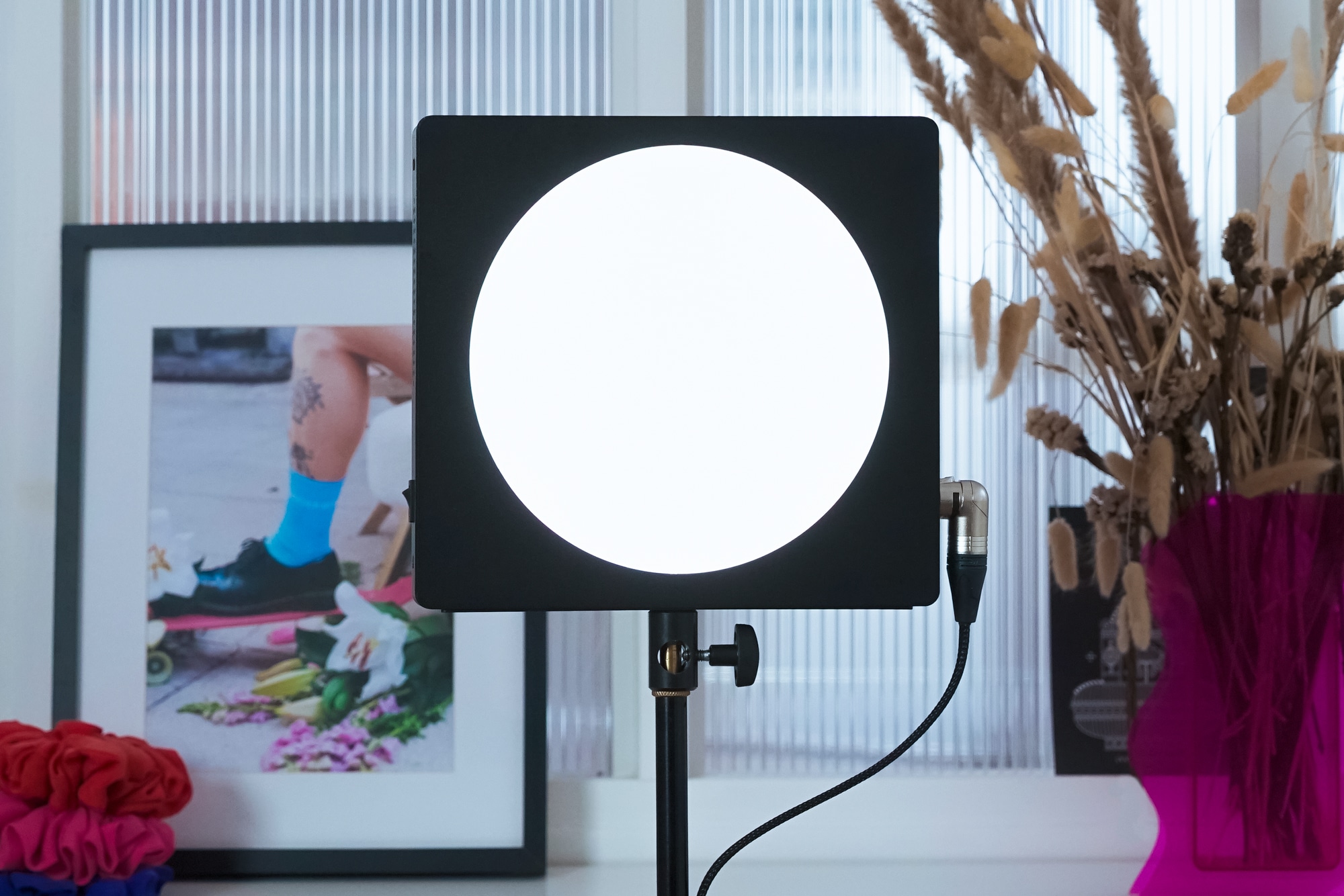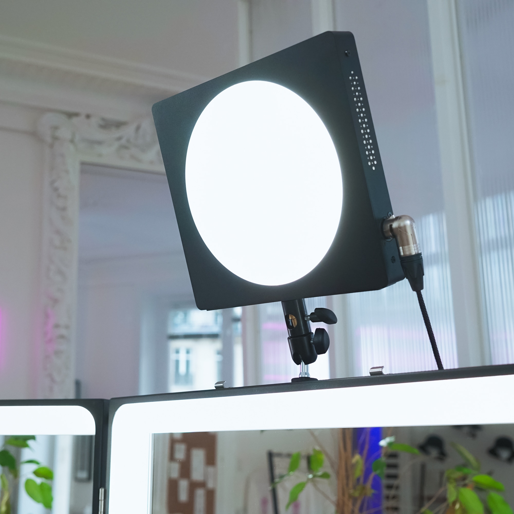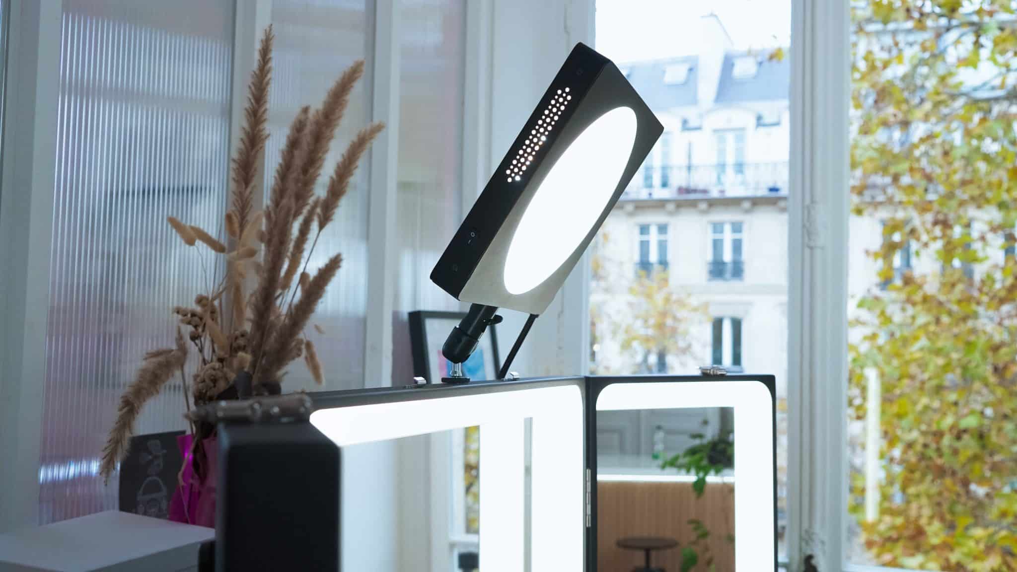 Its big plus is that it’s powered and directly controlled by the makeup mirror, without any additional power supply. So the Luna’s light intensity can adjust from 0 to 100% and its temperature from 2700 to 6100° K. The connection sits at the back of the mirror using an XLR connector.