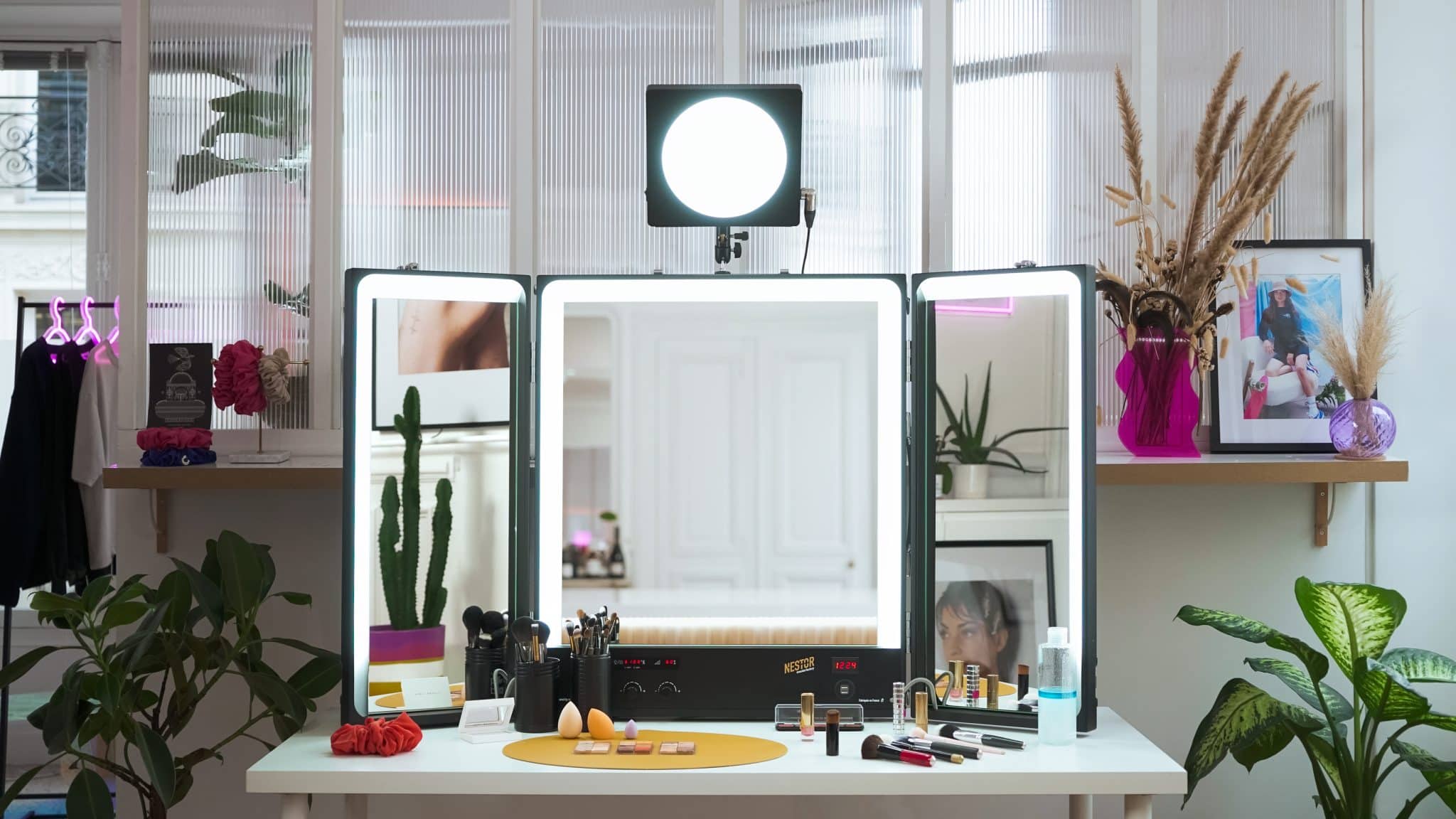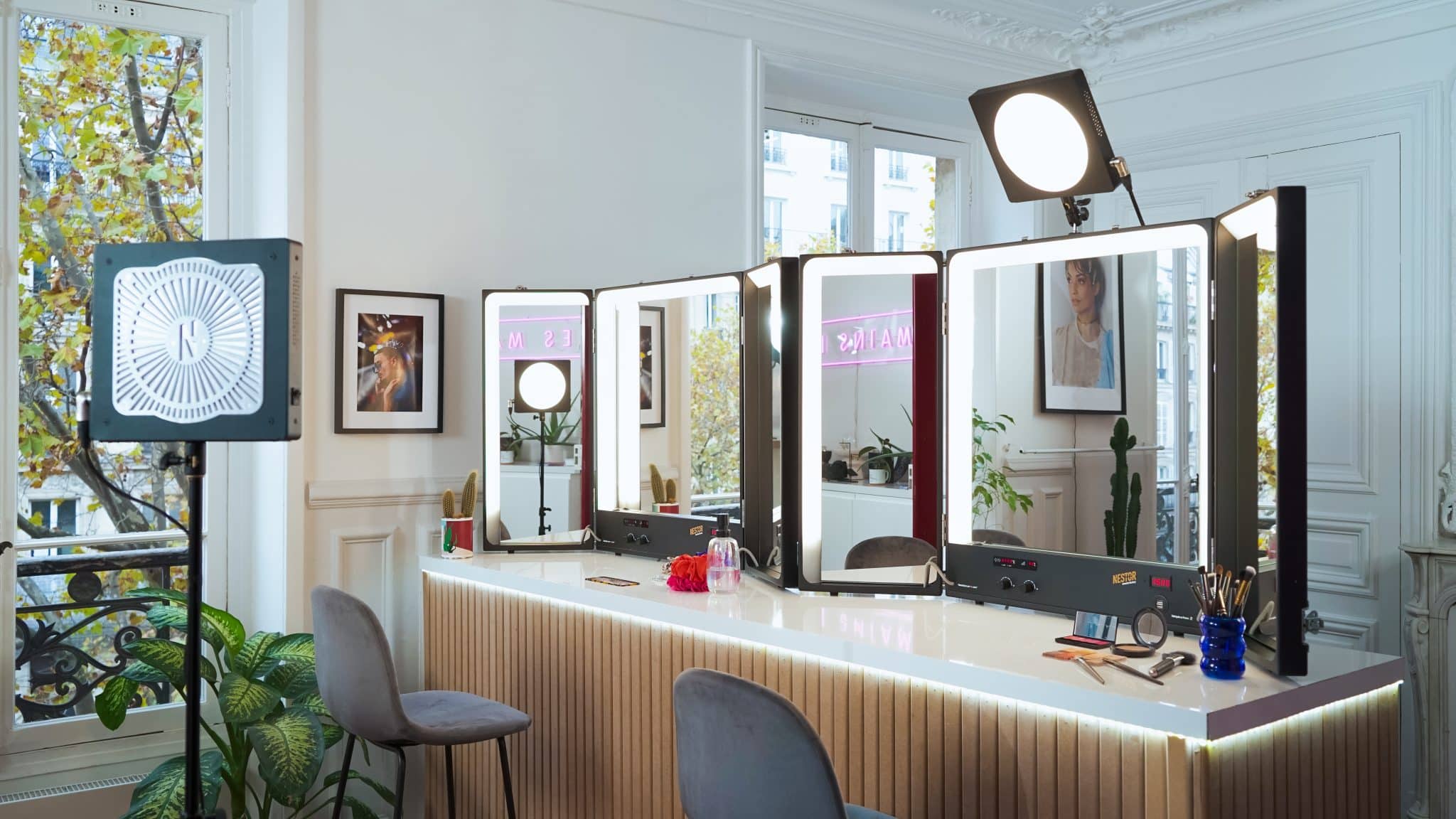 Some hair and makeup teams have got into the habit of renting Kino Flo lights to light up their work spaces. Fragile, unwieldy and pricey, these are very limited in their functionality and require a power supply ballast. For Nestor this was a challenge accepted!