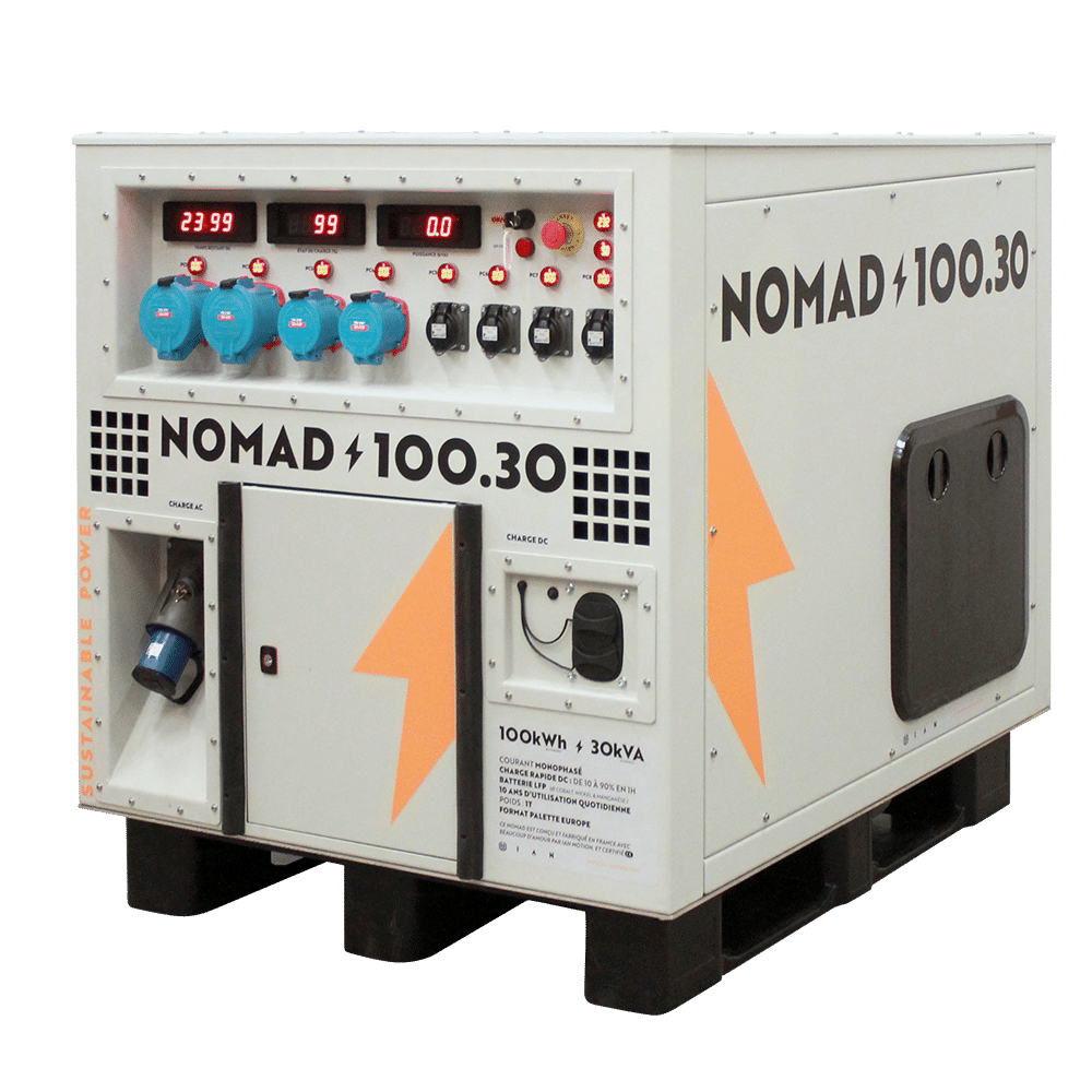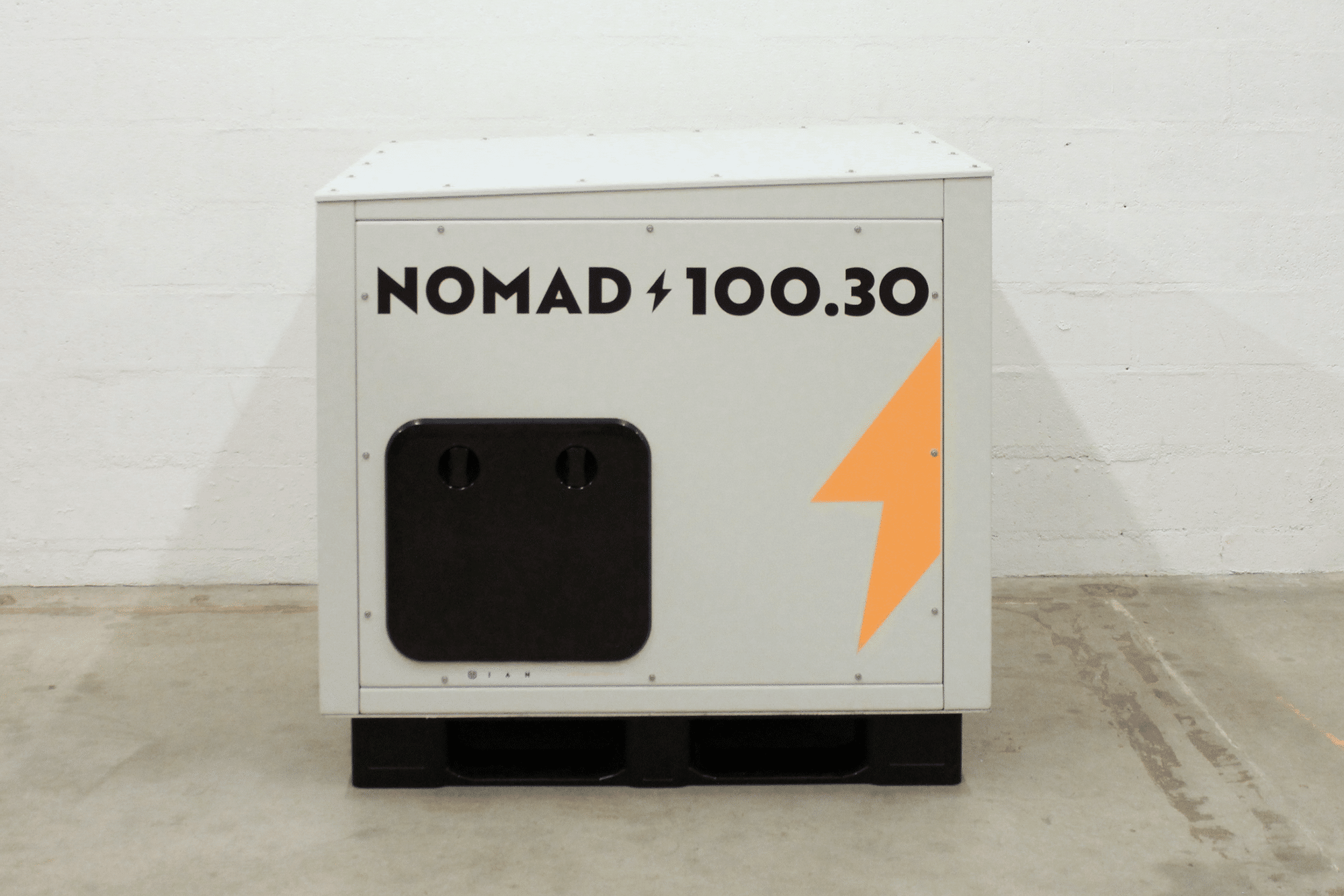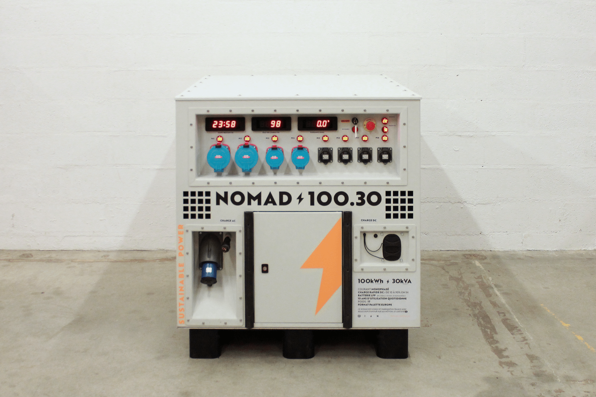 The Nomad 100.30 is a mobile power unit. Developed in collaboration with Ian Motion, it has a capacity of 100kWh and can deliver up to 30kW of continuous power.