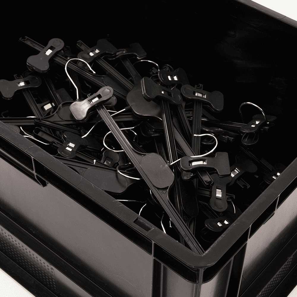 On a mis 50 cintres à pinces dans une caisse. Pas mal, non ?! En tout cas, ce sont vos jupes et pantalons qui seront ravis.