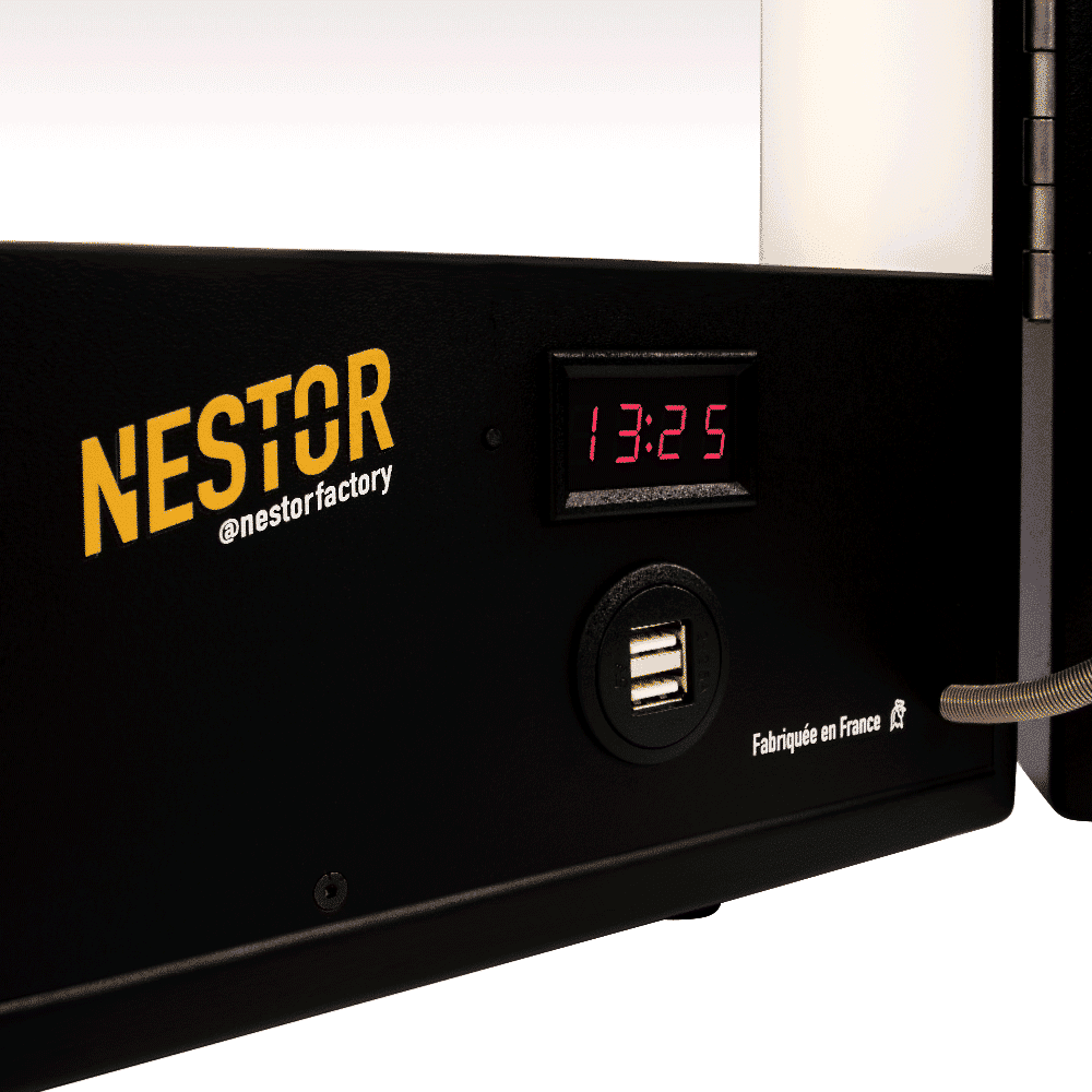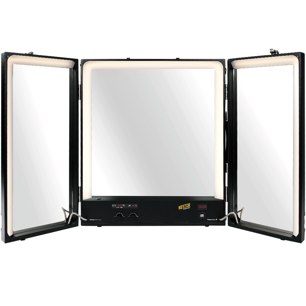 Grâce aux retours d’expérience, nous avons ajouté des bandeaux lumineux dans les portes, offrant une lumière plus homogène des visages. Nous sommes encore les seuls en Europe à proposer cet atout. La glace maq Nestor est également équipée d’un variateur avec affichage digital, qui contribue largement à son succès. Fruit de longues recherches avec notre partenaire Rubylight, qui l’utilise notamment pour son célèbre projecteur souple “Boa,” ce variateur permet de régler l’intensité lumineuse et la température de couleur de l’éclairage, pour recréer une lumière de travail identique à celle du plateau.