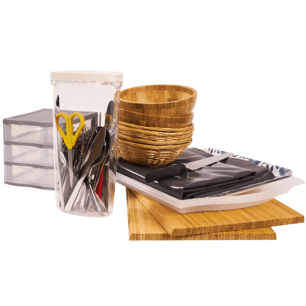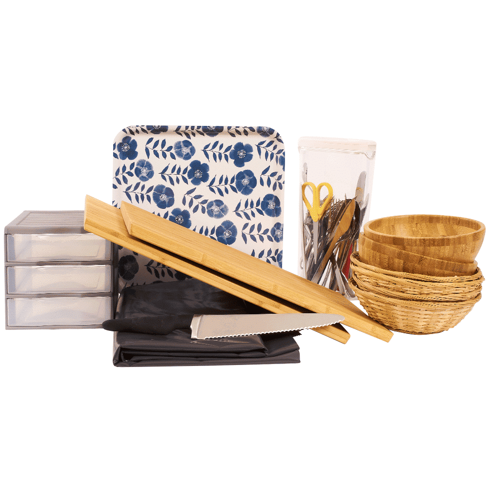 Contenu du kit :1 Nappe en toile cirée grise de 2m x 1,4m1 Bac 3 tiroirs2 Grandes planches à découper en bambou1 Plateau plastique transparent 52cm x 35cm2 Plateaux en plastique 33cm x 33cm2 petits saladiers en bambou1 couteau à pain1 ensemble de couverts4 Panières