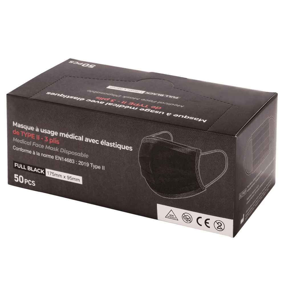 Boite de 50 masques chirurgicaux noir type II. – Sans couture permettant d’apporter un certain confort à celui qui le porte – Attaches par deux élastiques auriculaires larges et confortables – Taille unique pour adulte